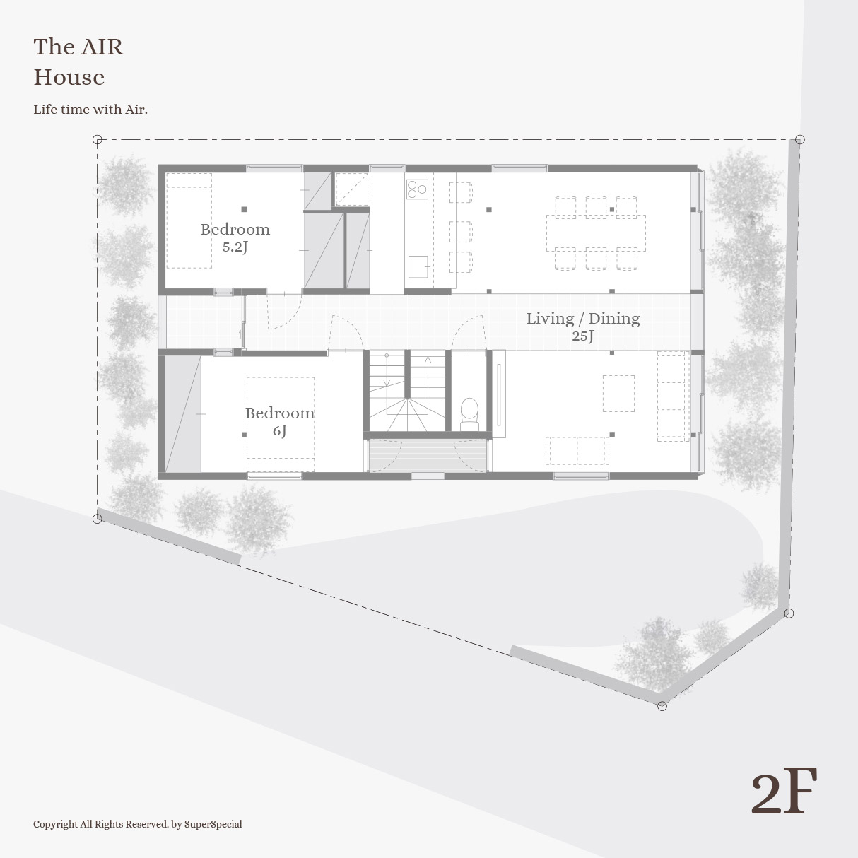 二階は、中央に土間の通った広いリビングダイニングと、二つの寝室