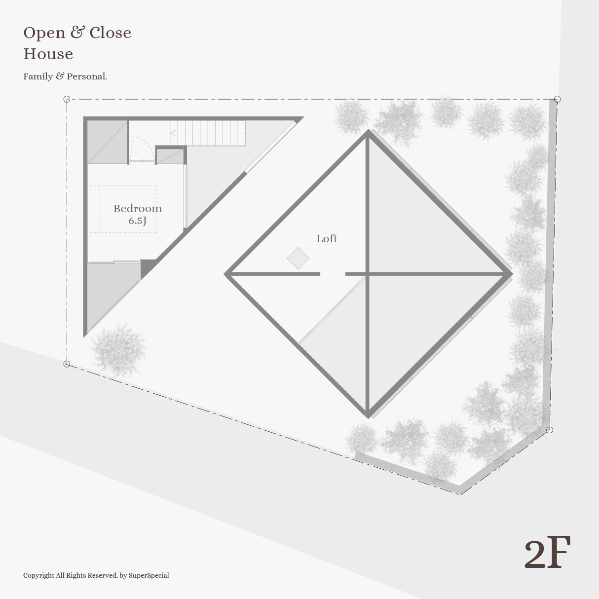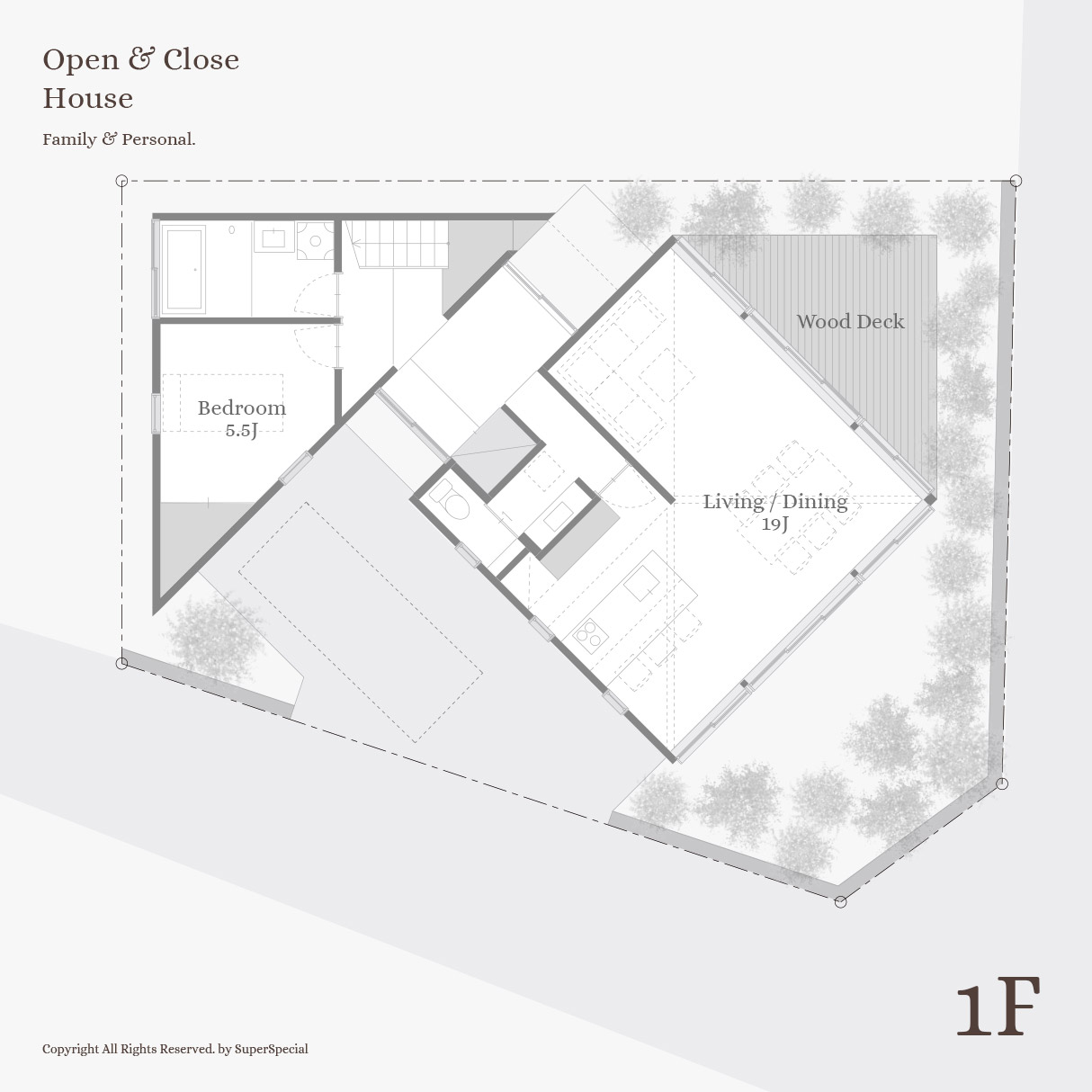 「開く」と「閉じる」を共存することで、一つの家の中にいくつもの生活リズムを受け入れるプランです。